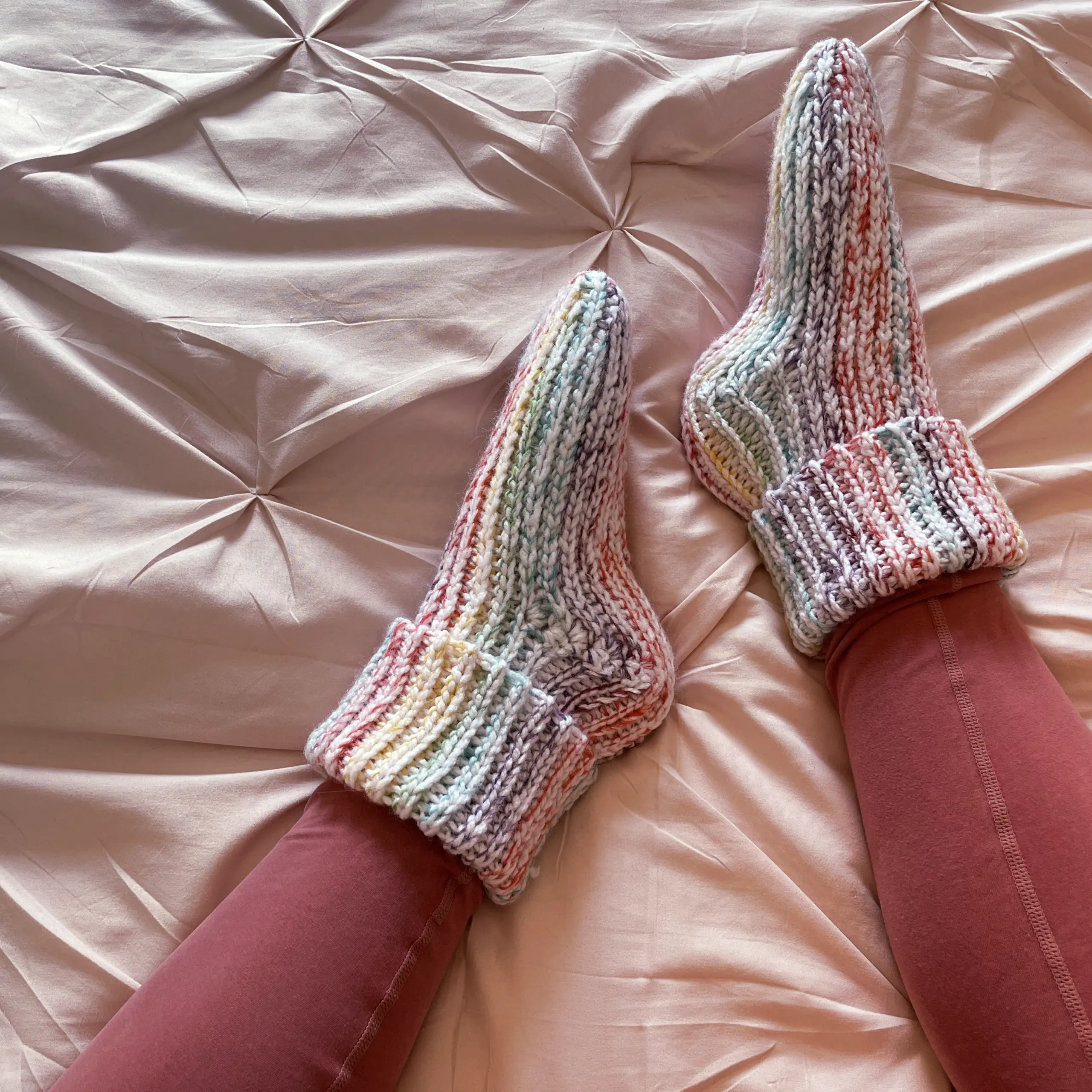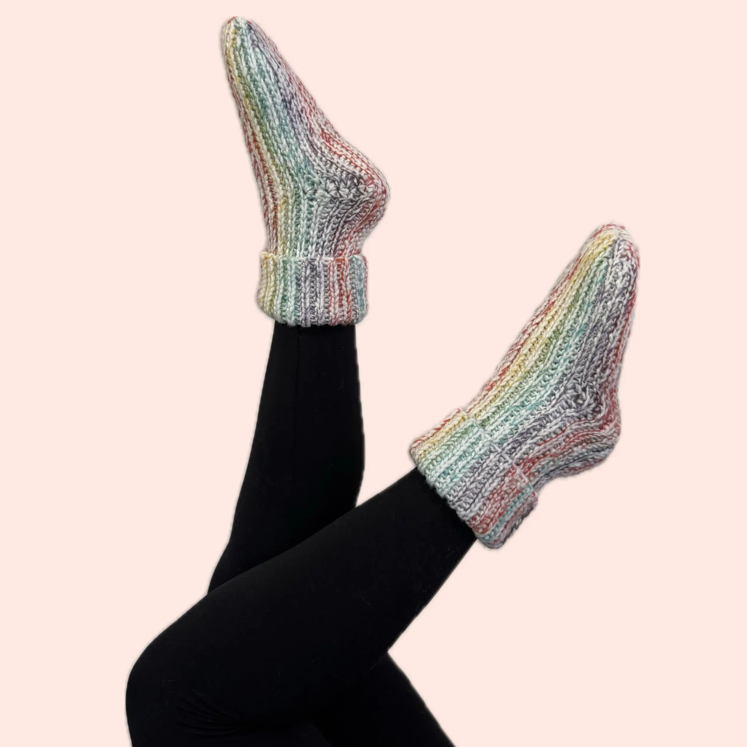 Diese gemütlichen und farbenfrohen Socken werden auf Bestellung handgehäkelt und bieten ultimativen Komfort.