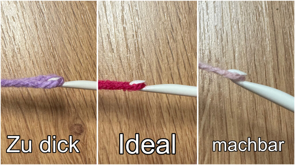 Der Faden füllt den Haken fast komplett aus und liegt sehr eng an. Dadurch kann er leicht von der Nadel rutschen oder sich beim Häkeln spalten. Außerdem wird das Maschenbild schnell unregelmäßig, weil du ständig nachjustieren musst.