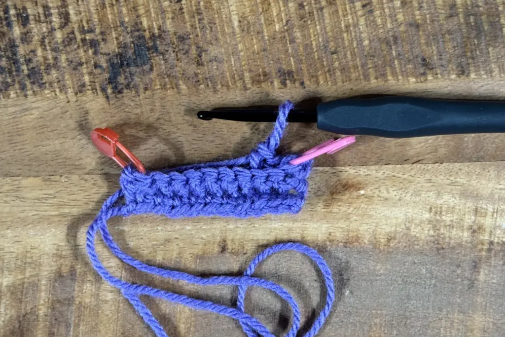 - Wenn du wendest, häkle eine Luftmasche und setze den Markierer in die erste gehäkelte Masche der neuen Reihe.